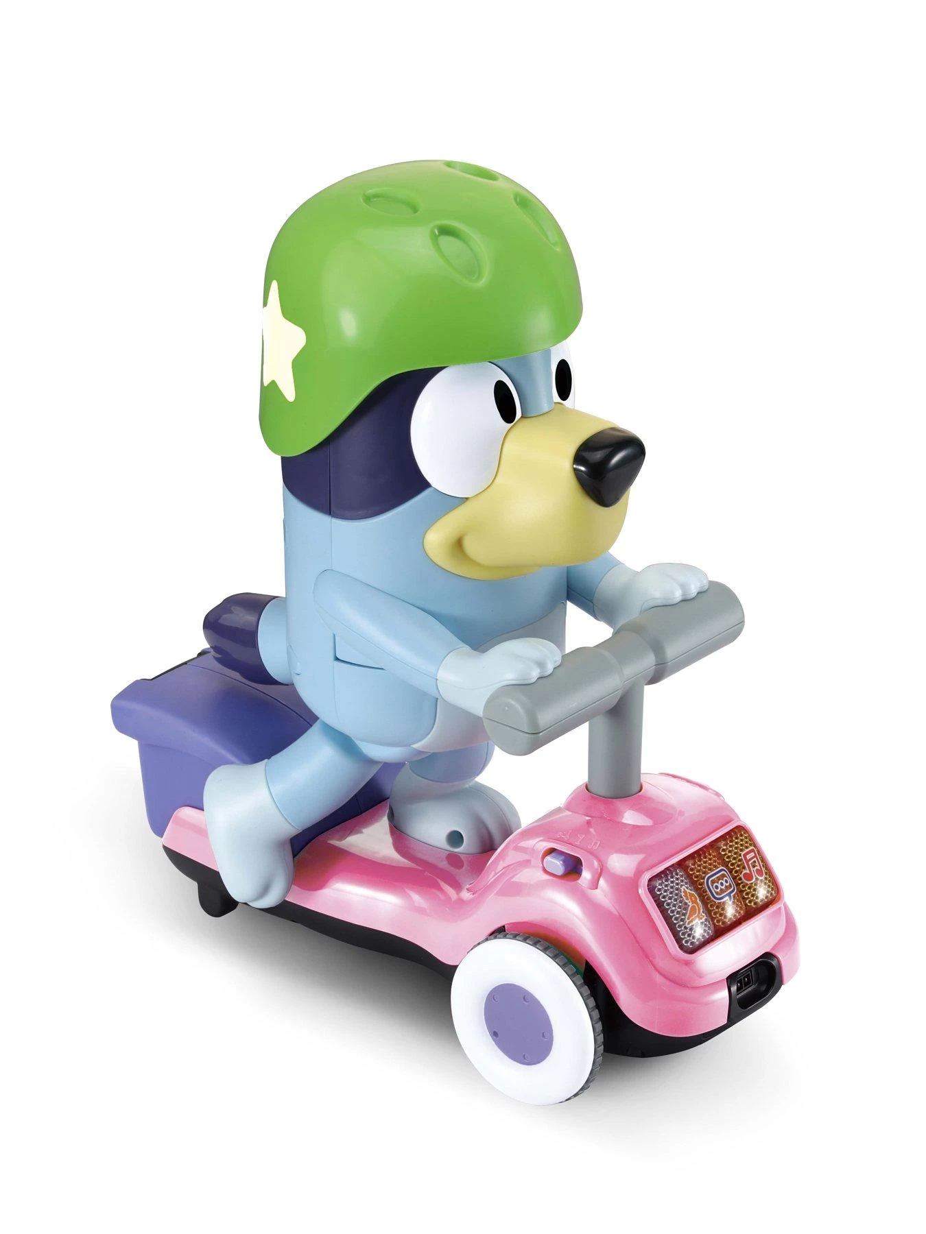 Play and have fun with Bluey as she scoots around, playing music, sounds and phrases straight from the hit TV show. Watch Bluey scoot forward or reverse turn, with front and rear sensors recognising obstacles to create a fun and interactive play experience. Bluey’s leg and tail move as she scoots along. Pay attention and follow Bluey’s moves and sounds in Follow Me mode or join her for dancing fun as she scoots around to the music in Show Time mode. Press the three light up buttons to hear music, Bluey phrases and nature sounds. Are you ready? Let’s do this!