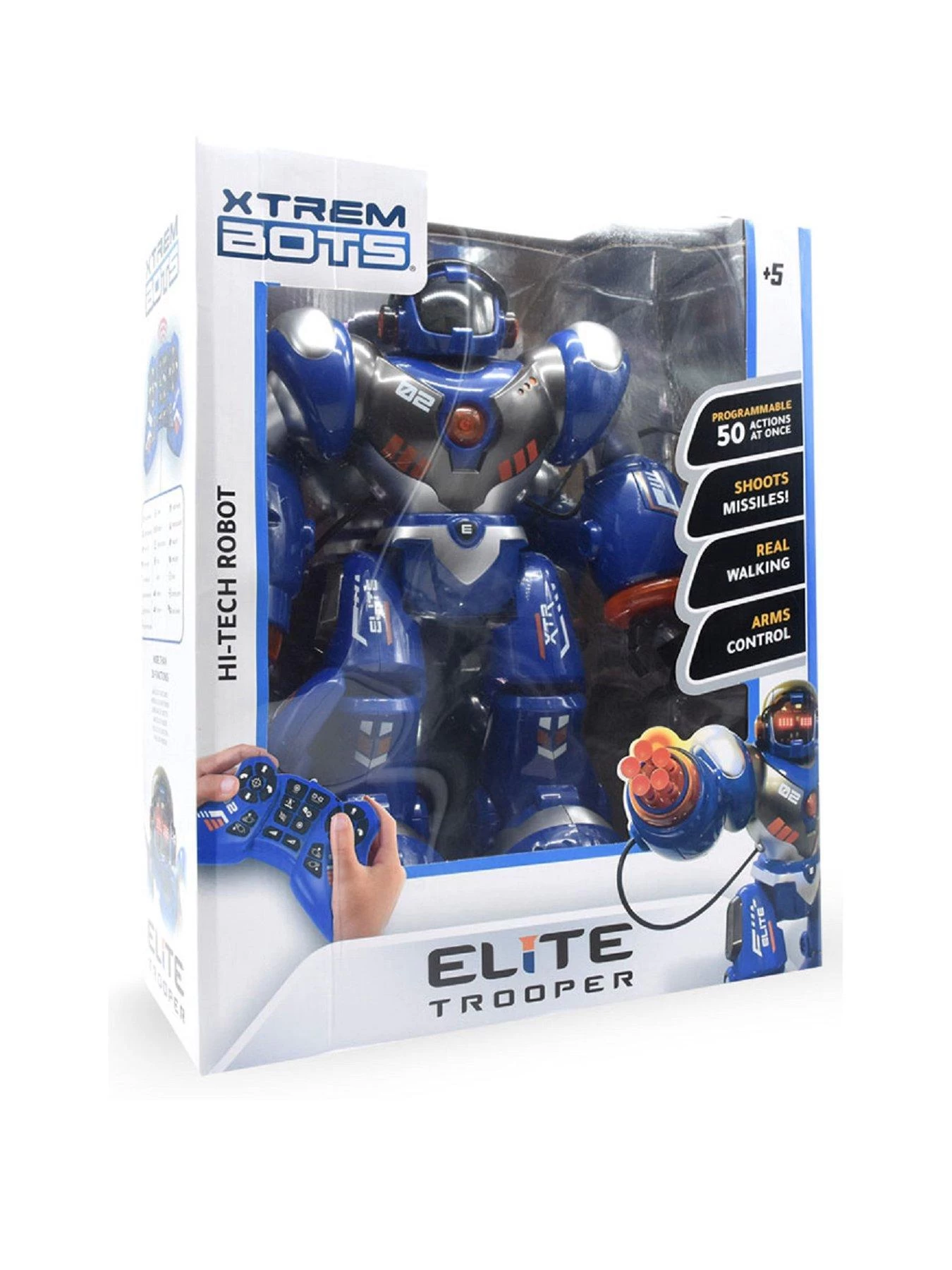 Xtrem Bot: Elite Trooper Robot Defeat your opponents with Elite Trooper! A programmable robot with up to 50 actions, with steerable arms and a 5-stud cannon. Includes lights and sounds.Elite Trooper bot is the ultimate toy robot. It can be controlled through its infrared remote control. It has two modes of movement and its arms are steerable.Load up his cannon arm and get ready for battle. Elite can fire up to 5 projectiles with his right arm. Point and shoot!